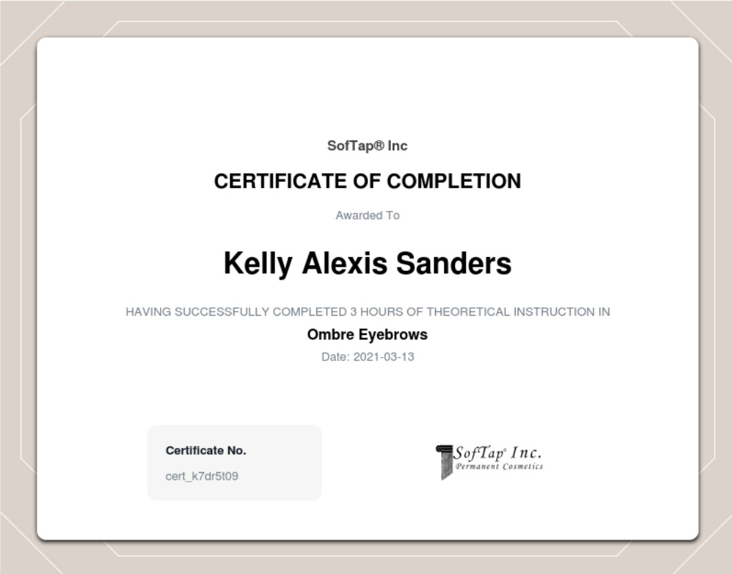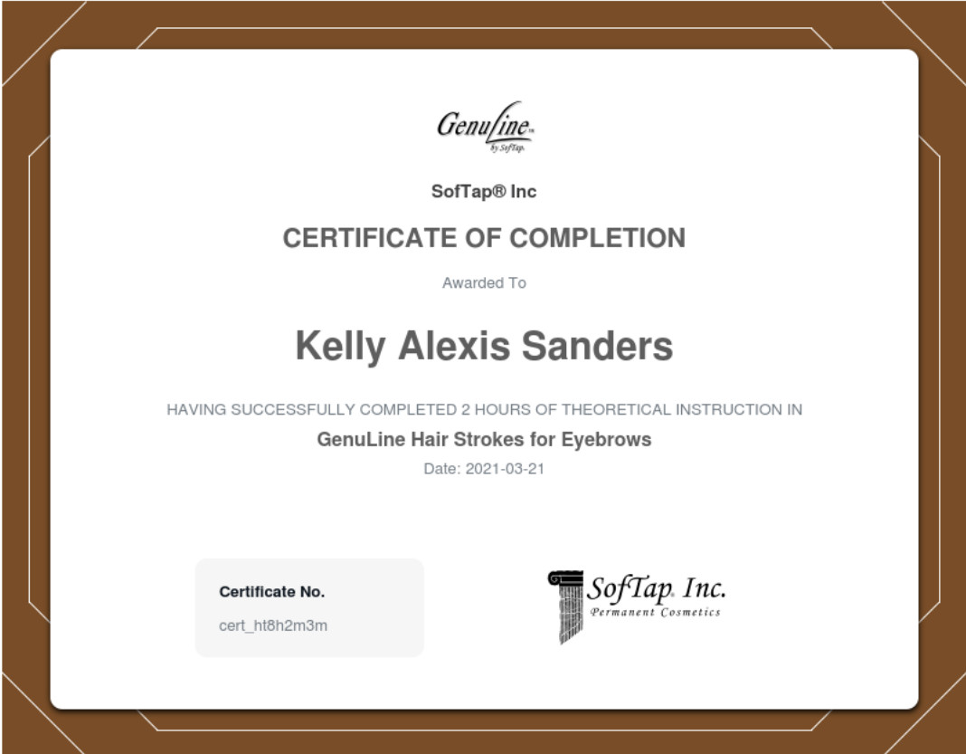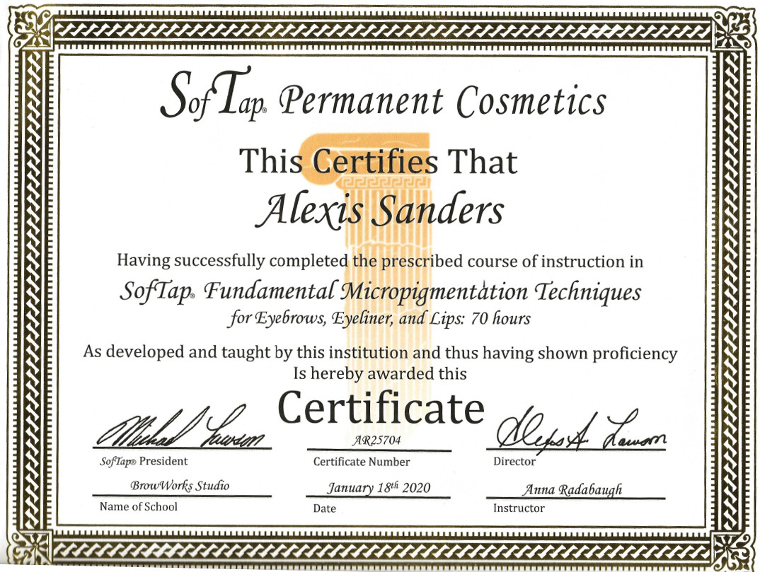 I am a trained and certified SofTap permanent makeup artist. Other certifications include SofTap ombre brows, SofTap GenuLine hair strokes, SofTap color theory, blood Bourne pathogens and Li-ft pigment removal.